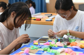 图为乡村留守儿童制作“生态山水卷”黏土作品