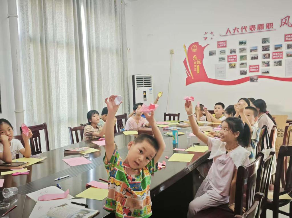 “巧手生花”释放无限创意:村庄的盎然绿意成为天然素材库。在志愿者的引导下,孩子们将收集来的树叶,通过剪、拼、贴的魔法,幻化成翩翩起舞的蝴蝶、优雅开屏的孔雀、憨态可掬的小熊。折纸课上,彩纸在灵巧的小手中翻飞,从千纸鹤到小青蛙,再到复杂的立体花朵,每一步折叠都充满了发现规律的惊喜与创造的乐趣。绘画课上孩子们发挥想象一幅幅“我眼中的机器人”、“我眼中的未来城市”等主题画作跃然纸上。