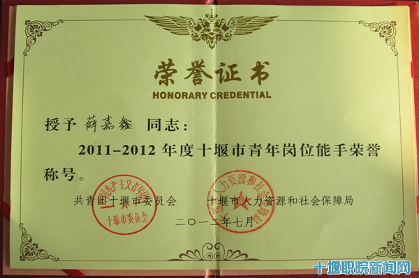 据悉,为表彰2011年以来全市各级各单位深入贯彻落实科学发展观,扎实开展“四创建功”活动,激发广大青年职工立足本岗位,学习新知识,掌握新技术,创造新业绩所涌现出的一批熟练掌握专业技能、立足岗位创新创效的青年职工典型,共青团十堰市委、市人力和社会保障局从全市各有关单位申报的人员中评比遴选后,决定授予薛嘉鑫等50名同志“2011-2012年度十堰市青年岗位能手”称号,365官网有二名教师被评为“十堰市青年岗位能手”。