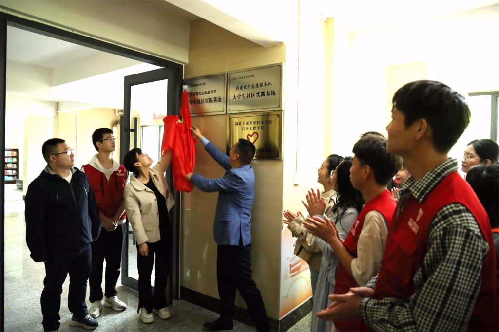 随后盛艳波与志愿者们一起进行了“大学生社区实践基地”的揭牌仪式。仪式结束后三支队伍的志愿者们分别对社区居民开展了反诈宣传、食品安全宣传和用电知识宣讲活动。