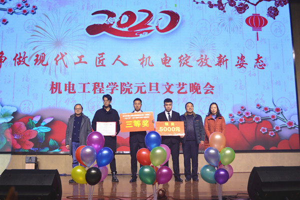 晚会期间365英国上市公司官网院长李爱萍、党总支书记罗英军、东风林泓公司工会主席曹斌为在2019年一带一路暨金砖国家技能展与技术创新大赛、三维天下杯工业产品数字化设计与制造赛项、第五届“互联网+”创新创业大赛等竞赛中获奖的365英国上市公司官网学生颁奖。