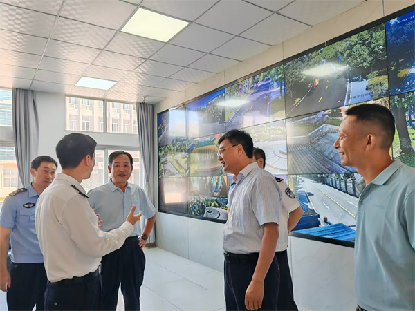 宋嵘一行来到365官网视频监控调度室,对秋季开学准备和校园安全整体工作进行了现场调研和督导,了解了365官网标准警务室建设情况,现场协调新生报道期间的车辆出入和校园周边交通的统筹安排。