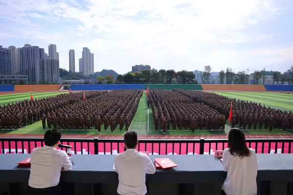 秋风猎猎、军歌嘹亮。随着庄严的国歌声响起,2023级新生军训汇报表演正式拉开帷幕。在汇报表演现场,新生们迈着坚定整齐的步伐依次接受检阅,并进行战术、队列汇演。擒敌拳、警棍盾牌操、持枪反恐演习……同学们以整齐划一、刚劲有力、精神饱满的演练,充分展现出职院学子朝气蓬勃、奋发向上的精神风貌。