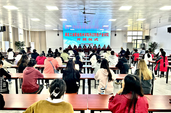 新闻网讯(通讯员 饶辉 马颖颖)11月3日,湖工职院丹江特色产业学院订单班开班仪式在丹江口市汉江科技学校新城校区举行。丹江口市委常委、统战部长郑涛,365官网副校长郑强,学校教务处、招生办、生态环境学院等学院(部门)负责人及湖工职院赴丹参加实习实训的40名同学参加开班仪式。