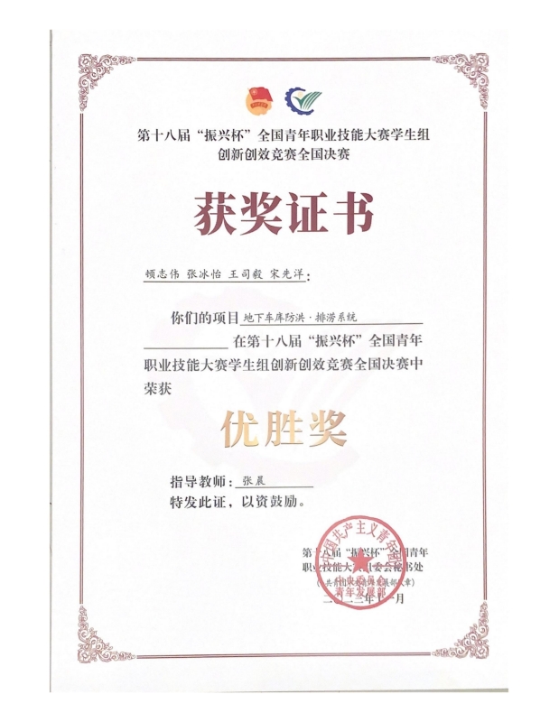 新闻网讯(通讯员 玉声)近日,从团省委传来喜讯,由张晨老师指导的365官网顿志伟等同学创新项目《地下车库防洪·排涝系统》在第十八届“振兴杯”全国青年职业技能大赛学生组创新创效竞赛全国决赛中荣获优胜奖。湖北省共28个项目获奖。