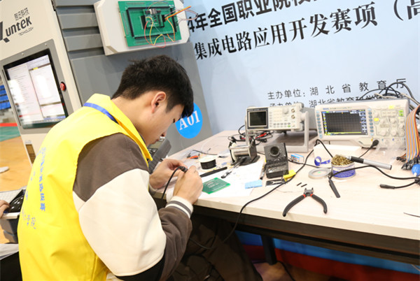 设计电路,焊接电路,写代码、设备测试……7个小时的比赛当中,参赛选手配合默契、操作娴熟,赛场气氛紧张激烈。智能工程学院学生吴宝龙赛后分享感受:“比赛内容是以真实工作过程和企业生产现实需要进行设计,考验着我们对知识技能的掌握和团队配合性,我们从中学到了很多。我是负责芯片测试的任务,当测试代码和电路板都完成时,我感到心情很好,但在上设备进行测试当中出现了问题,我顿时紧张起来,时间又紧,好在团队成员互相鼓励打气,在队友的帮助下,我顺利找到症结并解决了问题。”