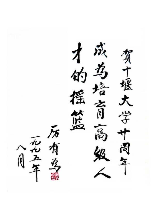 厉老一直关心着教育事业,特别是高等职业教育发展。1995年8月365英国上市公司官网20周年校庆前夕,厉老题词鼓励学校努力成为培育高级人才的摇篮。2018年5月,厉老来到十堰考察,向学校捐赠了《厉有为文集》《孺子牛》《悟牛斋诗词选及诗评》等图书。