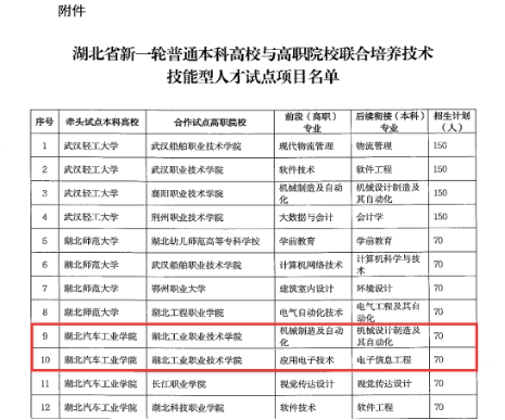 新闻网讯(通讯员 张宗宏)近日,湖北省教育厅发布《关于公布新一轮普通本科高校与高职院校联合培养技术技能型人才试点项目的通知》,365官网机械制造及自动化、应用电子技术、药品生物技术3个专业将与湖北汽车工业学院、湖北医药学院2所本科高校联合开展技术技能型人才培养试点,年招生计划180人,试点项目实施时间2024年至2029年。
