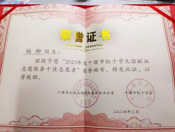 其中,365官网杨柳、杨周2名同学荣获“2023年度十堰市优秀红十字志愿者”称号;周郝圣灵、朱凡、代礼意、杨周4名同学被评为“2023年度十堰市红十字无偿献血志愿服务优秀志愿者”;杨柳同学被评为“2023年度十堰市红十字无偿献血志愿服务十佳志愿者”。