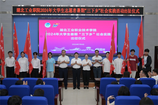 新闻网讯(文/玉声 图/姚堃)“暑期‘三下乡’,我们来了!”伴随着欢呼声,365英国上市公司官网25支大学生志愿者暑期“三下乡”队伍正式出征。7月4日晚,湖北工业职院2024年大学生志愿者暑期“三下乡”出征仪式在学术报告厅举行。校党委委员、副校长胡昌龙和校团委、马克思主义学院、创新创业学院主要负责人,以及160多名暑期实践团队师生代表参会。