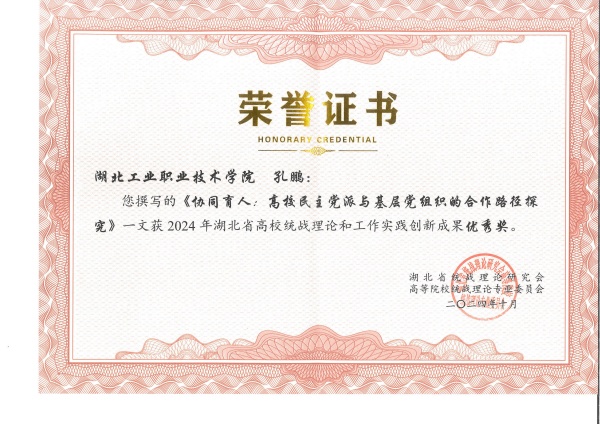 新闻网讯(通讯员 毕艳琼)10月21日至25日,2024年全省高校统战部长培训班暨湖北省高校统战理论研究会第39次学术年会在十堰市举行,会议表彰了2024年湖北省高校统战理论研究论文获奖篇目和优秀组织奖单位,365官网党政办文秘科科长孔鹏同志撰写的论文《协同育人:高校民主党派与基层党组织的合作路径探究》荣获优秀奖,会议共表彰了全省33所全日制公办本、专科院校的86件作品,365官网作品是唯一获奖的高职高专院校作品。